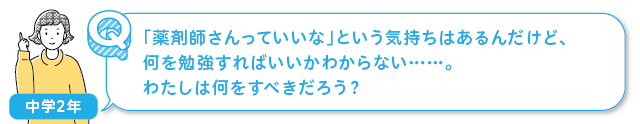 それから、薬剤師は薬という物を扱う仕事という印象があるかもしれませんが、 実際はお医者さんや看護師さんと相談しながら治療で使う薬を決めたり、目の前の患者さんの気持ちに寄り添ったりする必要も出てきます。つまり、人と接する仕事ということですね。いろいろな年代の人とコミュニケーションを取ることになるので、中学生のうちから初対面の人とも上手くコミュニケーションを取るための練習を積んでいくのもよいでしょう。 例えば友達だけでなく、まずは挨拶からで構わないので、先輩後輩や学校の先生に自分から話しかけてみてはどうでしょうか?