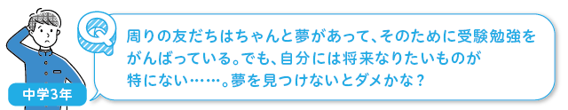 夢がないのは、まったくダメなことではありません! ただ、いつも先生が言ってるように、今楽をして「選択肢の数を少なくすること」は、今後いつかなりたい夢が見つかったときに、出鼻をくじかれてしまうかもしれない。それは避けてもらいたいので 今のうちから何にでもなれるよう準備をしておきましょう。先生も実際、「こうなりたい!」と思ったのは高校3年のときでしたが、それまである程度は勉強をがんばって大学も選択できるくらいになっていたから、スムーズに進路を決めることができました。受験もそうですが、「自分はこれをがんばらないといけない!」ということが見つかって、それをやり遂げるだけでも、すごく大事な経験になりますし、受験だからこそ、そういった「やり切る」体験を得られます。最後までやり抜いて、後悔がない高校受験にしていきましょうね!