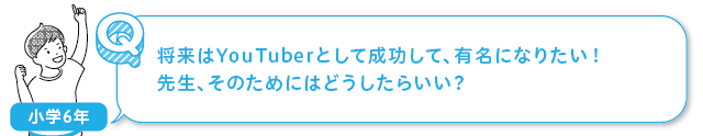 好きなこと、将来やりたい夢があるのは素晴らしいですね! 私の娘もYouTubeが好きで、一緒に見ることもあります。さて、YouTubeで成功している人にはどのような特徴があると思いますか? 先生は、「大好きなことを突き詰める力がある」ということが1つ挙げられると思います。好きなことでないと、ずっと動画を作り続けることはできないですよね。では、好きなことを突き詰めるにはどうすればいいのか、ですが、そこで勉強が登場します。意外かもしれませんが、勉強では、「いろいろな世界を知る経験」「調べる方法」「大人に質問する力」を得ることができます。だからこそ、「これだ!」というものが見つかった時に、さらに詳しくそのことを知る手段を持っているのは大きな武器です。YouTuber以外の職業に就く場合も、この力は役立ちます。だから、これからも一緒に勉強していきましょう!