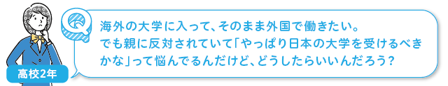 海外に行きたいという目標があるんですね。そのような目標があることは、非常に素晴らしいと思います。ところで、海外の大学に入りたい理由、外国で働きたい理由はどのようなものになりますか? 例えば、日本の大学を卒業した後に海外で働いている人もいるわけですが、それでも海外の大学を目指す理由って何でしょうか。もし、そこの部分が明確に言語化できていなかったり、ご家族の方にも説明できていないのであれば、ご家族の方も不安になってしまうと思います。まずは、海外の大学を目指す理由、海外で働きたい理由をもっと明確に言葉にしていきましょう。それは、ご家族の方を説得するためだけのものではなくて、この先の大学受験の勉強をがんばっていく際に、がんばる理由が明確であればあるほど、あなたを支えてくれる強力な柱になりますよ!